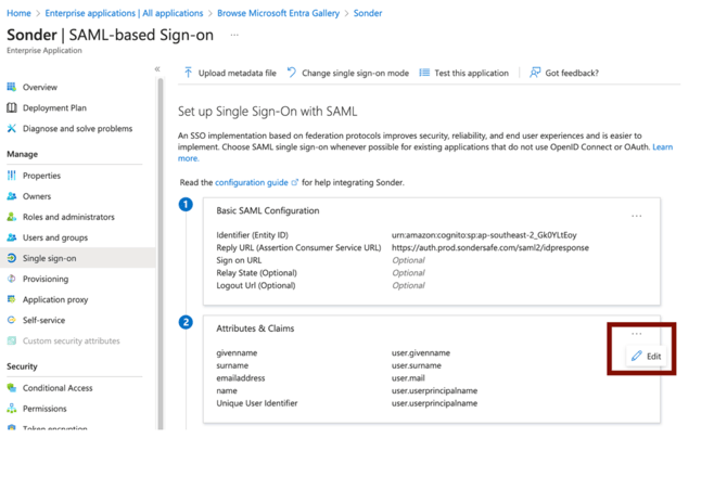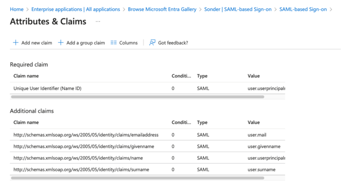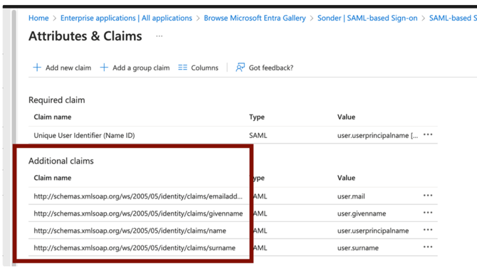 In the Additional Claims section, Sonder requires email, givenname and surname for SSO Configuration. You do not need to change anything unless you want to change the Value column, e.g. change user.surname to user.sn if you have surname populated in the user.sn field instead of user.surname in your system.